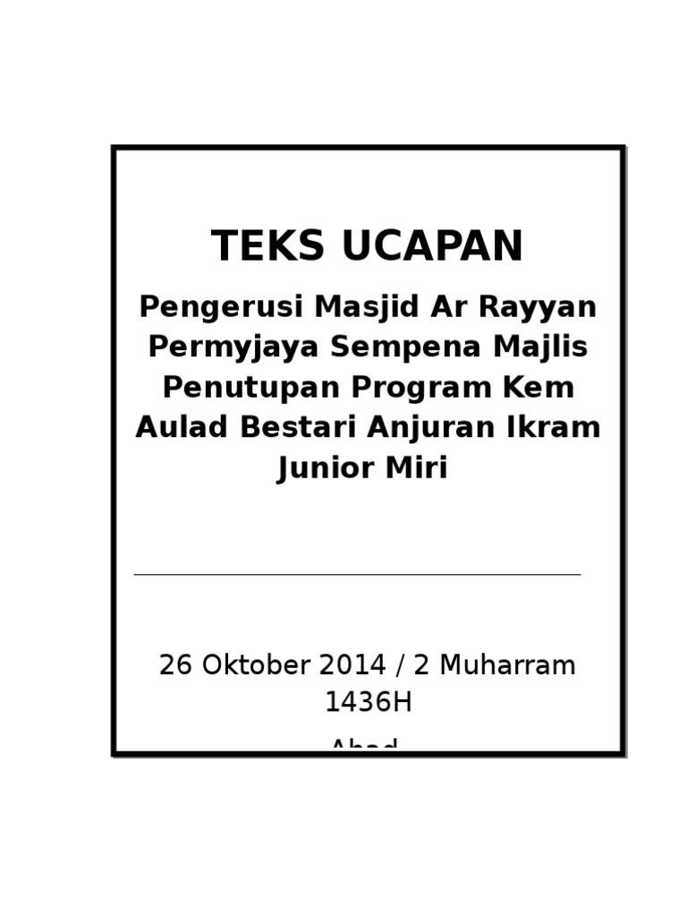 Cara ucapan pengerusi masjid. Tetapi jika pengerusi tidak pergi bersama lebih baik anda bawa balik borang tersebut dan isinya di rumah dan mintak PENGERUSI turunkan tandatangan pada borang itudan. Hadirin yang dimuliakan Majlis akan bermula sebentar lagi untuk itu tuan-tuan dan puan-puan serta hadirin sekalian diminta mengambil. 1 Skrip Pengacara bukan teks ucapan pengacara.