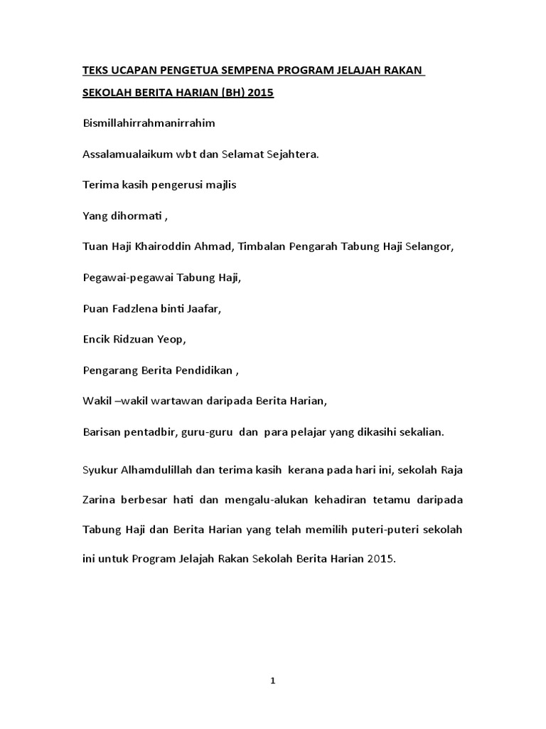 Teks Ucapan Pengetua Sempena Program Jelajah Rakan Sekolah Berita Harian 2015 Pdf