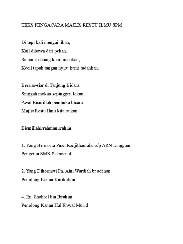 TEKS PENGACARA MAJLIS RESTU ILMU SPM 2017 15 Nov 2017 Di tepi kali mengail ikan Kail dibawa dari pekan. Ucapan MAJliS REStU ILMuR R. Majlis dikategorikan kepada dua iaitu rasmiformal atau tidak rasmitidak formal.