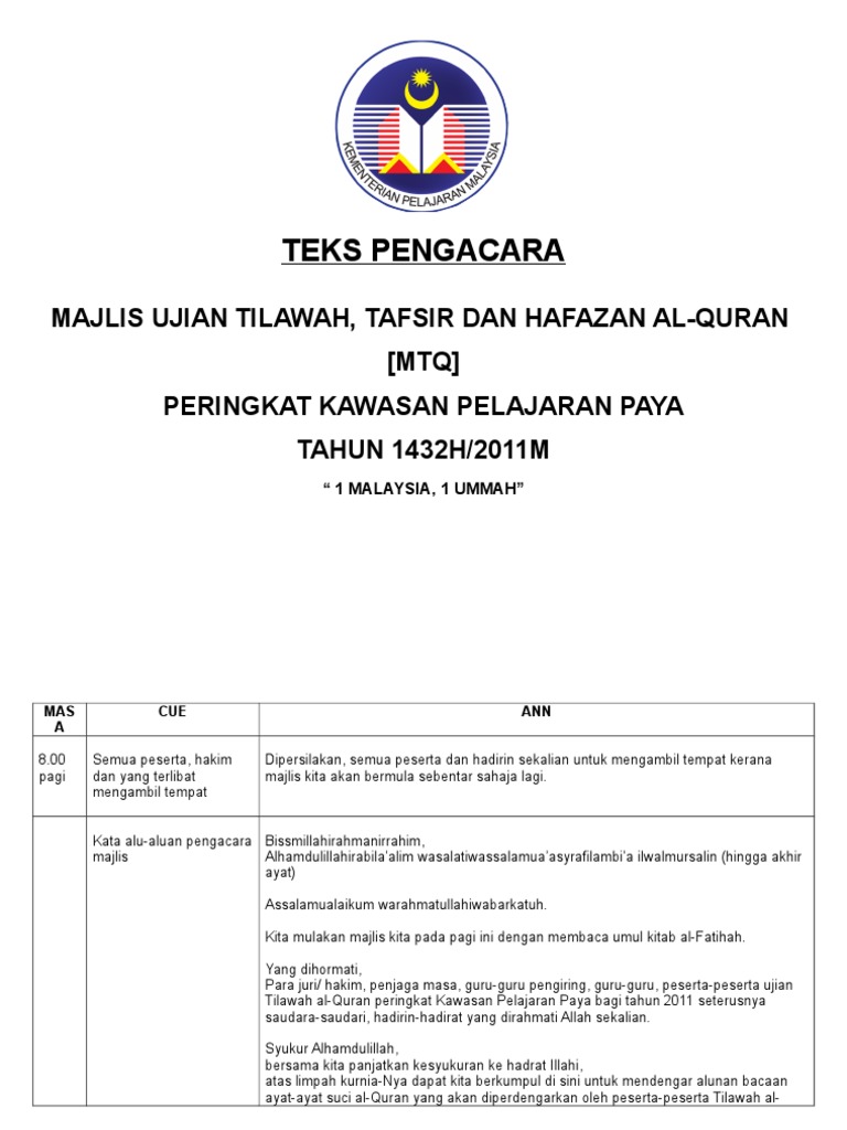 Teks Pengacara Majlis Tilawah Al Quran Peringkat Kawasan Pelajaran Paya Pdf