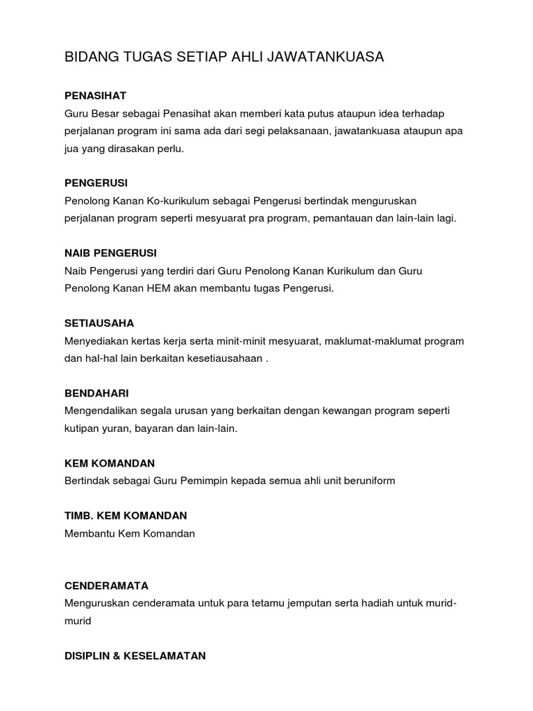 Download Full PDF Package. Menerima laporan kegiatan unit kokurikulum pada akhir tahun daripada setiausaha kokurikulum penolong setiausaha kokurikulum dan. Unit Sukan Kokurikulum PKB Bidang Tugas Jawatankuasa Ketua Biro Mengetuai satu kumpulan kecil ahli bagi melaksanakan sesuatu tugas yang ditetapkan mengikut biro Menjalankan tugas mengikut ketetapan perlembagaan Membantu pengerusi dan setiausaha melaksanakan tugas yang telah ditetapkan mengikut perlembagaan persatuan.