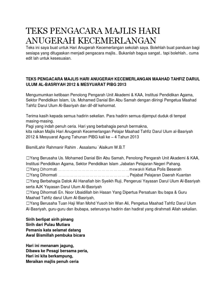 Teks Pengacara Majlis Hari Anugerah Kecemerlangan Pdf
