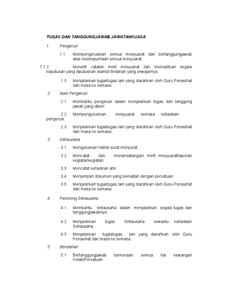 Timbalan Pengerusi Membantu pengerusi untuk menjalankan tugas dan tanggungjawab yang diberi. Find more similar flip PDFs like KERTAS KERJA PENUBUHAN PERSATUAN BAHASA MELAYU. Tugas dan Tanggungjawab Guru Rumah Sukan.
