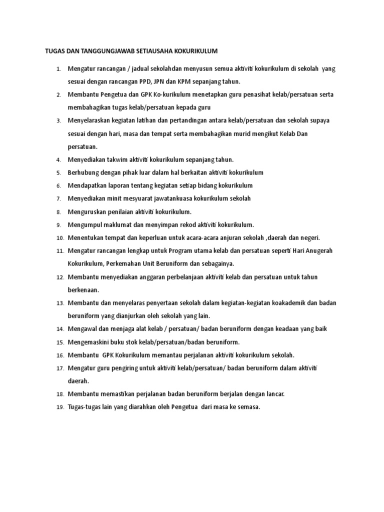 Mengagihkan murid dalam rumah kepada beberapa acara sukan dan permainan. SENARAI TUGAS GURU PENOLONG KANAN KOKURIKULUM 11 Mukadimah. Download KERTAS KERJA PENUBUHAN PERSATUAN BAHASA MELAYU PDF for free.
