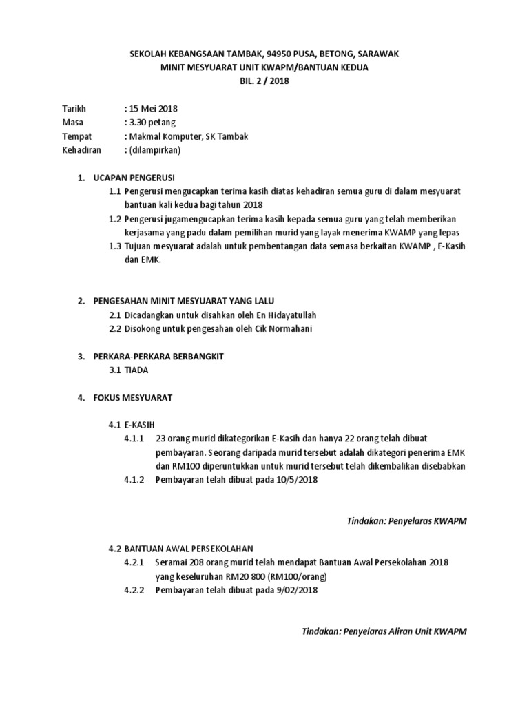 Assalamualaikum warahmatullahi wabarakatuh salam sejahtera salam negaraku malaysia. Terima kasih pengerusi majlis. Contoh minit mesyuarat panitia BM.