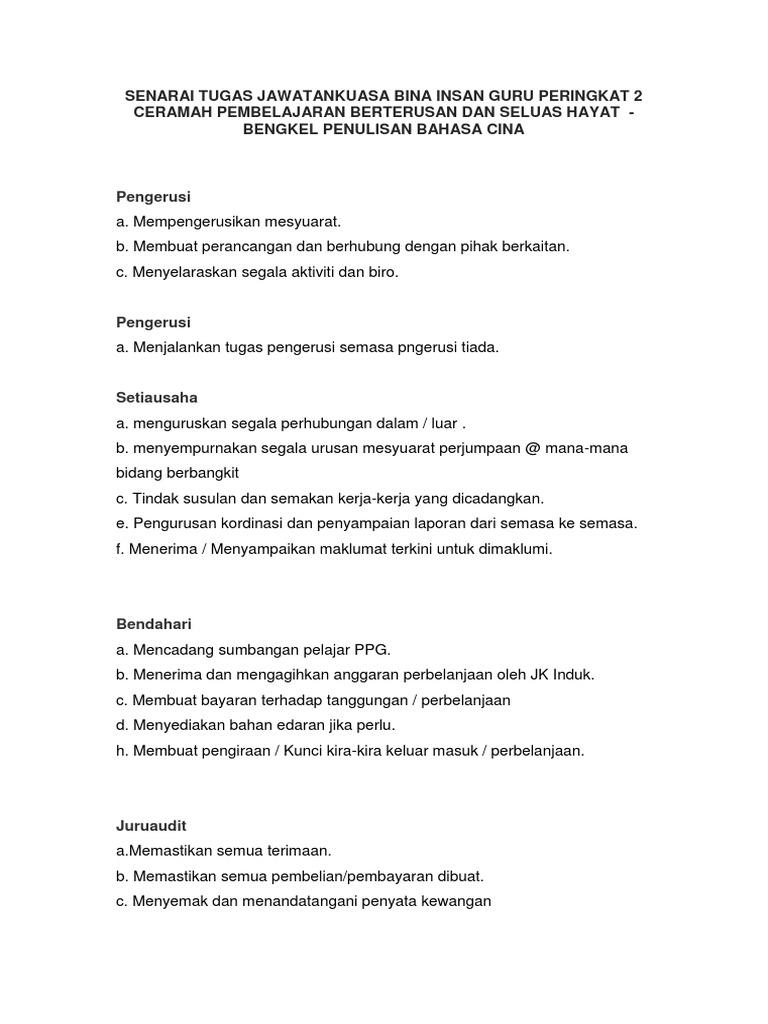 Senarai tugas pengerusi. Pengetua adalah seorang pentadbir pengurus dan yang lebih utama mereka adalah seorang pemimpin. Mengawasi dan menentukan segala program atau perancangan di peringkat jawatankuasa berjalan dengan baik. Bidang Tugas dan Tanggungjawab Ahli-ahli Jawatan Kuasa Pengerusi Bertanggungjawab dalam menguruskan pentadbiran kewangan dan aktiviti.